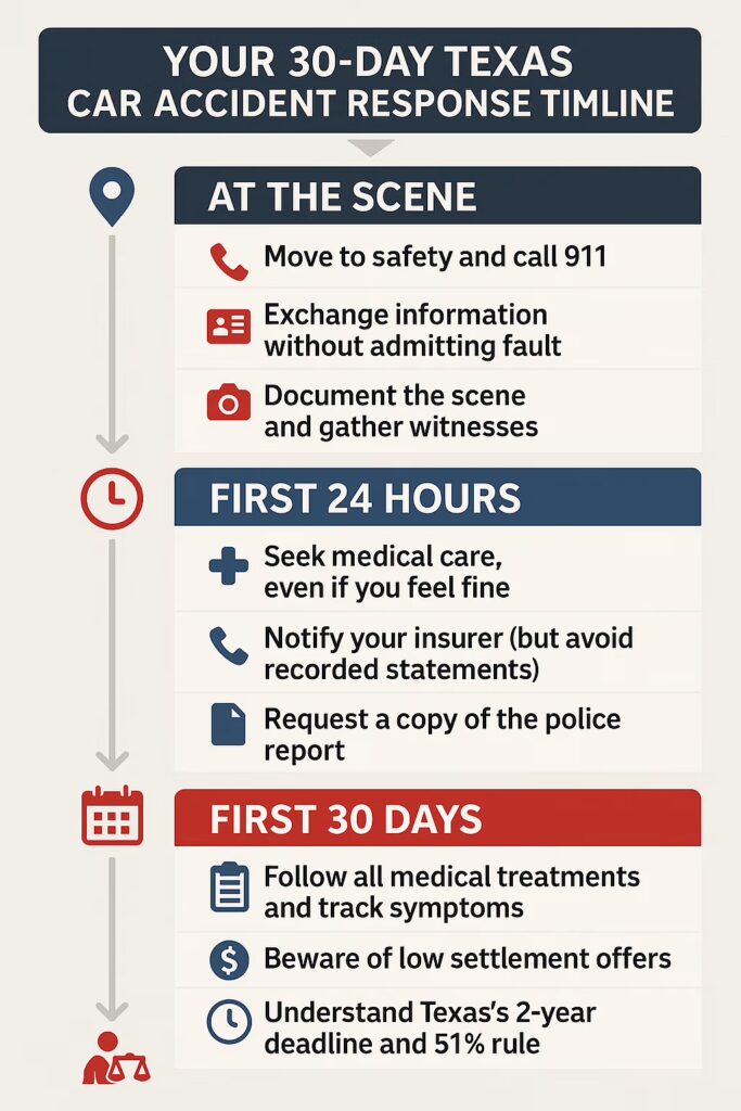 Delays give insurers grounds to deny coverage or argue your injuries aren’t accident-related. While Texas law provides two years for lawsuits, insurance claims have much shorter practical deadlines.